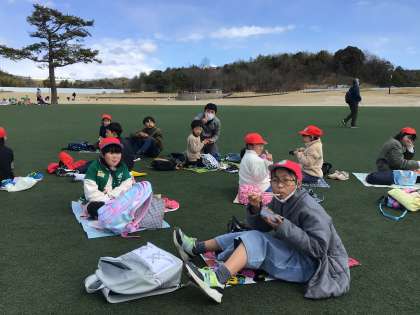 芝生広場の真ん中で食べる班が多くあります。美味しそうに食べています。風が強く、袋が飛んで追い掛ける姿がたまに見られます。