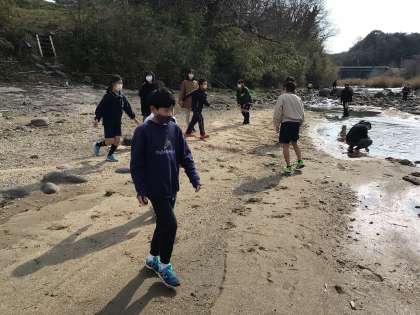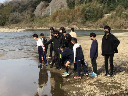 矢作川河川敷に降りると、綺麗な水に触れたり石投げをしたり、ゴミ拾いをしたりしながら最後の水測活動を楽しみました。校地に戻ると、ボトルやメスシリンダーなどの水測の道具を磨いて綺麗にしました。