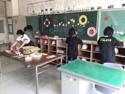 3・4・5年生が卒業式の準備をしています。式会場である体育館の整備や階段の掲示板、6年生教室の飾り付けを行なっています。6年生が卒業を迎えるにあたり、晴れやかな舞台を作ろうと、全校を挙げて取り組んでいます。
