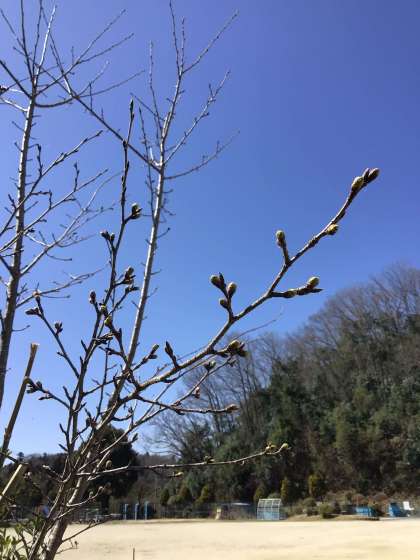 12月に植えました6年生の桜です。蕾もずいぶん大きく膨らんできました。何輪咲くのか、開花する日が楽しみです。