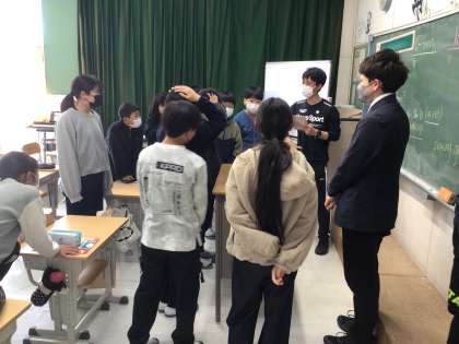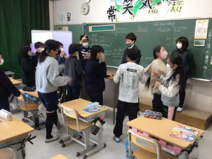 ALTイアン先生による今年度最後の授業です。2チームに分かれて英単語クイズを行なっていました。「図書室」「小学校」「家庭科」などの言葉を英語で答える早押しクイズです。「library」はとても早く答えていました。「high school?」惜しい答えでした。6年生ではどのような単語を学ぶのでしょうか。