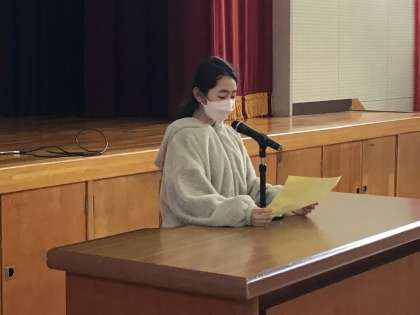 5年生の児童は、キャンプでの皆で協力した経験と、縦割り班で散策したジブリパークの楽しい思い出について語りました。また、卒業式の校歌伴奏をやり遂げ自信を深め、新年度は皆のお手本になれるように行動したいと締めくくりました。