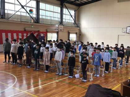 修了式の最後に、校歌を合唱しました。卒業式の練習から、元気よく歌うことができています。入学式でも、新入生入学の歓迎する気持ちを込めて、元気よく歌う姿がイメージできます。