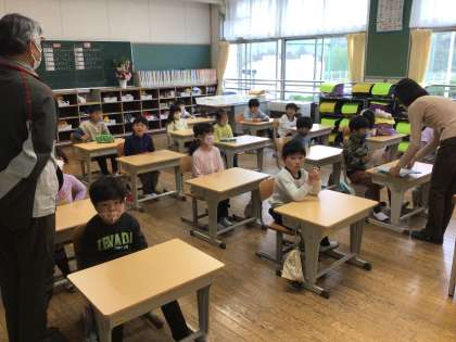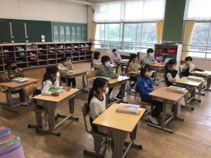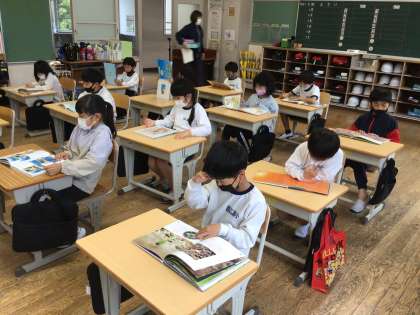 8時15分、始業時間です。1年生はランドセルから学習用具を出し、片付けを終え、先生のお話を聞いています。2年生はとても静かに読書をしています。3年生は、姿勢良く、先生のお話を聞いています。