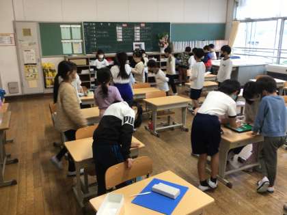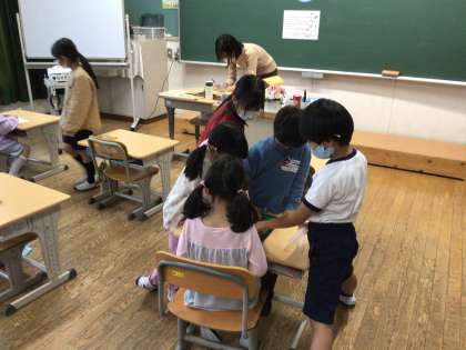 今日は雨が降っているので、室内で過ごしています。1年生の教室には、2年生以上のお兄さん、お姉さんが遊びにきてくれました。