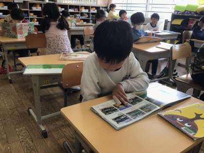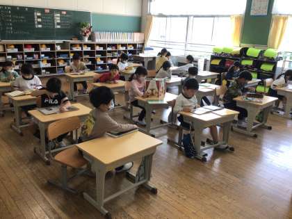 1年生の教室に行きました。当初は用具の片付けに時間がかかっていた1年生でしたが、静かに読書する姿が見られました。数日間に成長を感じます。
