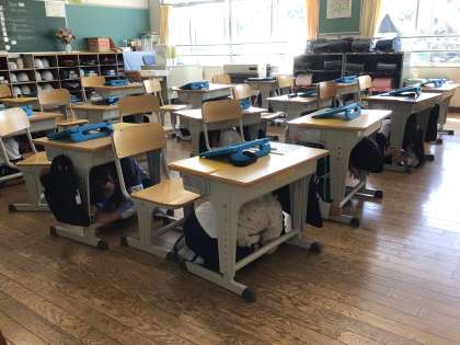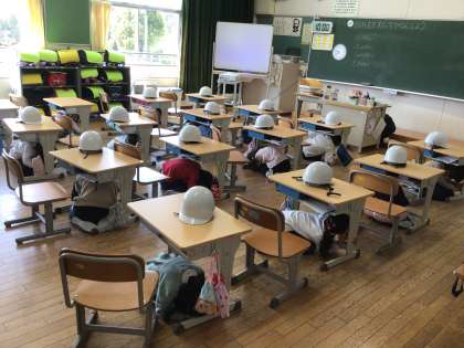 雨天の為、金曜日から延期していました避難訓練を、本日2時間目に行いました。地震速報の放送が入ると、1・2年生は素早く机の下に潜り込み、次の放送を静かに待っていました。
