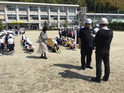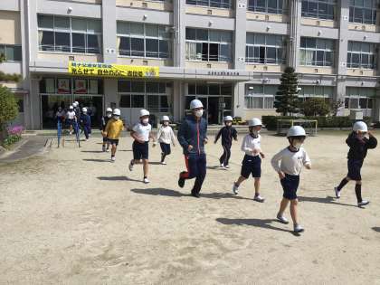 「運動場への避難開始」の放送が入ると、全校児童は一斉に、整然と運動場へ避難しました。