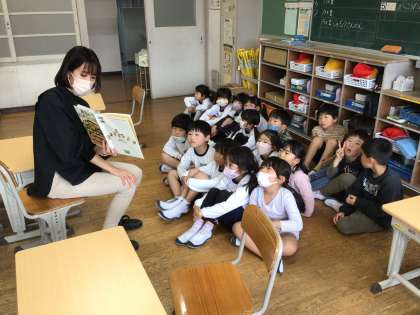 1年生は絵本の読み聞かせをしていました。授業中は間違ってもいい、みんなで意見を出し合って、正解を探す、間違っても責められない、みんなが安心して参加できる授業をめざそうとの絵本の言葉が、担任からのメッセージでした。