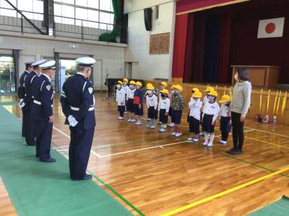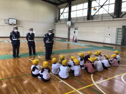 1年生が交通安全教室を行いました。4名の交通指導員さんが早朝より来校し、体育館内に道路と信号を設置してくださいました。信号のある横断歩道や、信号のない交差点、踏切等の安全な渡り方を教わりました。