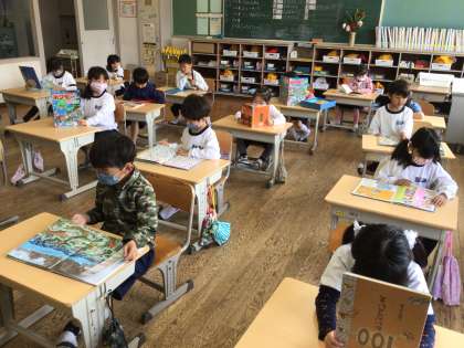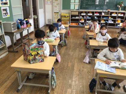 1年生の準備が日々早くなっています。静かに読書をする姿が見られます。明日は学校公開日です。国語の参観授業でも、落ち着いて参加する姿が見られることでしょう。