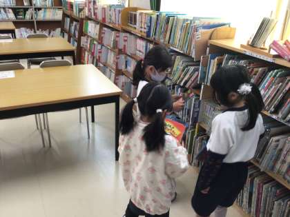 図書室にきました。1年生の子どもたちが本を返却し、自分で新しい本を借りていました。バーコードで読み取って簡単に手続きできます。司書さんが児童名を登録をしましたので、早速貸し出しができています。どんな本が人気なのでしょうか。また貸出の際にもらえる図書委員が作ったおみくじが大人気でした。