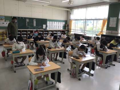 4年生の学習タイムは漢字のテストでした。先生の説明を聞き、皆、真剣に漢字を書いていました。テストをすると、あいまいに覚えた漢字がはっきりわかります。見直しをして正確に覚える作業が大切です。
