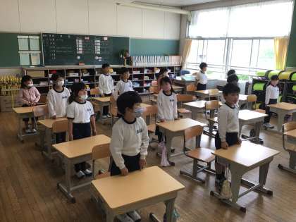 1年生は朝の会に、当番の児童が前に立って、西広瀬小のめあてを読み上げました。「にっこり笑顔で…」を自分たちで掲示を見ながらスラスラと言えましたので担任の先生に褒められていました。