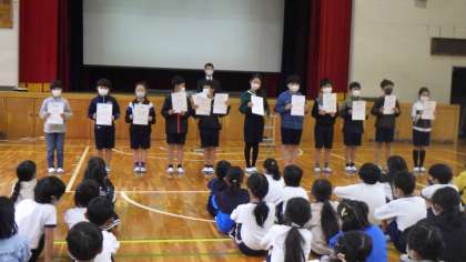 今日の朝の会は、前期児童会長や委員長、学級委員等の認証を行いました。