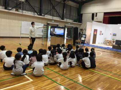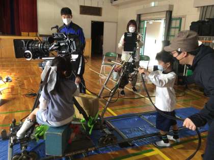 低学年の授業が始まりました。比嘉一志監督から役割を説明され、それぞれが監督、カメラマン、俳優、照明、音響に分かれてドラマを撮ります。