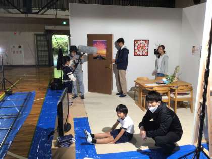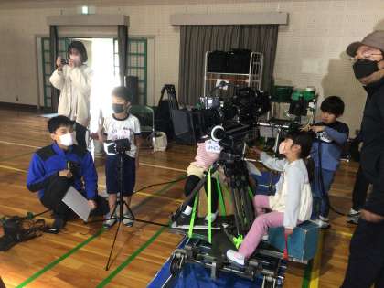 低学年を4つの班に分けて順番に撮影体験をしています。役割を教えてもらった子どもたちは、本番緊張して役割を務めました。終わった後は緊張が解け、とてもいい笑顔になりました。