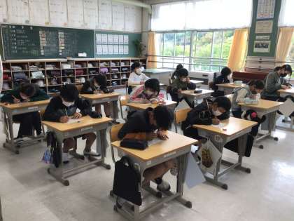 6年生の教室では、昨日の映画撮影体験授業の感想を書いていました。プロの方々が使用する本物の機材を使った撮影体験でしたので、緊張しながらもリアルな撮影体験が出来ました。感想は、監督をはじめ関係者の方々に届けます。