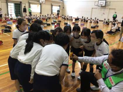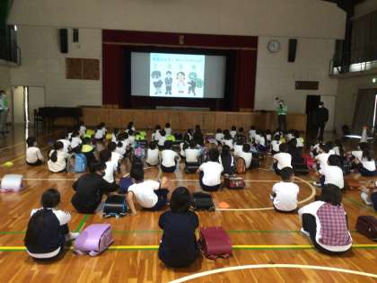 3時間目に全校で「防犯教室」を実施しました。市役所から派遣された地域安全指導員の方々が講師となり、不審者への対応の仕方を教えてくださいました。地域で危険な場所、トイレ利用時の注意、大声の出し方、防犯ブザーの活用等、大変丁寧な説明で、児童は楽しく学びました。GW中も安全に気をつけ、事件事故に遭わないように心がけてほしいです。