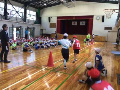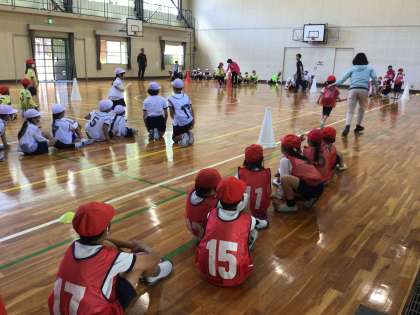 2時間目の運動会練習は全校リレーの練習をしました。運動場がぬかるんでいる為、体育館に集まりました。バトンパスの説明後に6年生が手本を示してくれました。全校練習の前に体育部の教諭と高学年は様々な準備をしてくれています。組ごとの練習により、素早いバトンパスを身につけられるでしょうか。