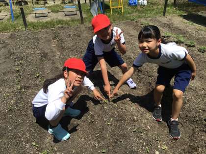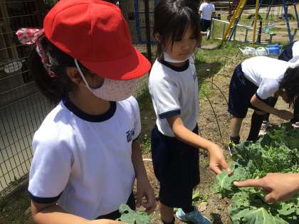 運動場から歓声が聞こえたので様子を見にいきました。2年生が畑の周りで観察していました。まずキャベツの葉にいるモンシロチョウの幼虫とサナギを見つけました。葉と一緒に虫かごに入れていました。次に畑に植えたオクラと、ひまわりの様子を観察しました。雑草と区別がつかず、もう少し育てて様子を見ることにしました。