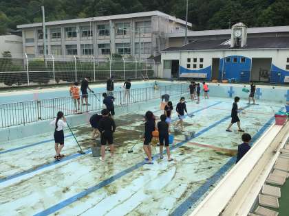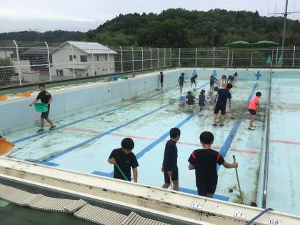 3時間目に5•6年生がプール掃除をしています。1年間でたまった汚れを洗い流し、6月7日のプール開きに向けて整備を進めてくれています。今後は他学年の応援でプールサイドや更衣室の清掃をする予定です。普段の掃除とは違う作業に、楽しそうに取り組んでいます。