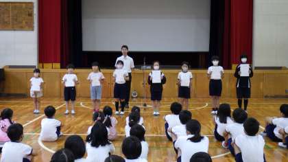 5月の清流賞の披露がありました。今回は1年生から6年生まで、8名表彰しました。表彰を受けた児童の善行を、皆で見習いましょう。
