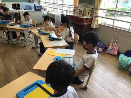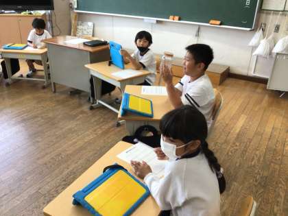 今朝、職員室外にいた蜂を教頭先生が捕まえて瓶に入れました。児童の安全の為、駆除してきましたが、今回は、生物の研究をしている低学年の観察にどうかと担任に渡しました。瓶に入っている蜂の体の特徴を、自分の好きな生物と比較しながら児童は観察していました。