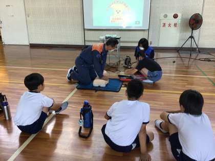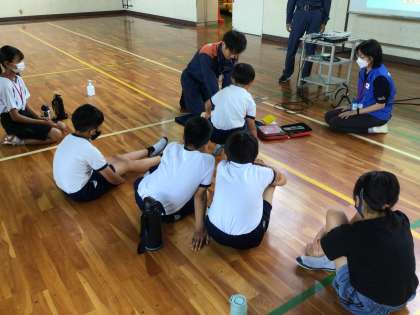 本校は毎年、5年生を対象に、救急救命講習を行なっています。高学年の児童には、知識を得れば人を助ける役割を十分担えると期待をしているからです。倒れている人を見かけたら、どのように呼びかけるか、周りの人と協力してどのように蘇生をするかを学びました。本校にも整備されているAEDの利用の仕方も学びました。