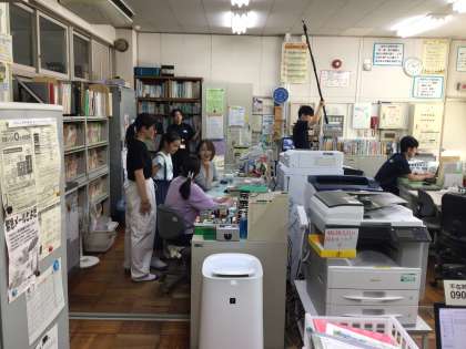 今日から撮影が始まります。業界用語のクランクインです。今日のシーンは、なぜ水質測定を行うのか、疑問をもった6年生が担任に質問をする職員室でのシーンです。何度もテストを行い、本番の撮影を行いますが、本番もさまざまな角度からカメラで撮り重ねていきます。