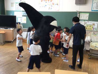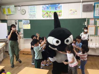 名古屋グランパスからグランパスくんが来校し、各学級を訪問しました。児童の安全な登下校の啓発活動として、下校に立ち会ってくれます。下校の前の時間を使っての交流でした。グランパスくんの登場に、どのクラスからも歓声が上がりました。今日からより一層、安全な登下校を意識してほしいです。