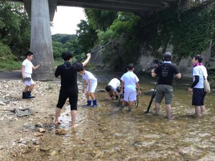 5時間目に5年生の撮影の立ち会いに飯野川に向かいました。昭和50年頃、掃除をして綺麗になった飯野川で遊びたいと活動を始めた高学年の姿を再現しました。また、水質汚濁調査の初期は、橋の中央から赤いバケツを下ろして水を汲んでいましたので、小道具や衣装を忠実に再現して撮影しました。撮影を体験することは、47年間続いている活動の意義に触れる事であると、立ち会いながら感じています。