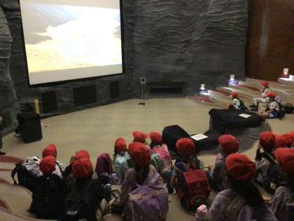 蒲郡市に到着しました。天気は小雨です。スムーズにバスから館内に移動しました。1年生から4年生はミニシアターに入りました。