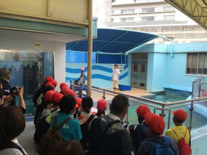 淡水魚から熱帯魚コーナーを通り、リクガメを見ました。子供のリクガメが4匹いて、児童は大喜びで見ていました。屋外スペースではアシカショーが始まりました。