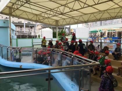児童はアシカショーに大満足でした。この後はトイレ休憩をすませてバスに向かいます。待っている間に、子どものアシカの練習場面を見ることができました。