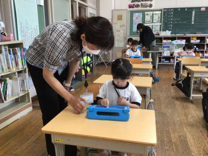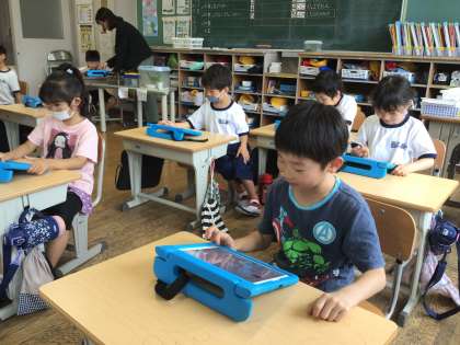 今日は1日ICT支援員さんが来校し、各学年に応じたタブレットPCを活用した授業を支援します。1年生はプログラミング学習に取り組みました。意図した命令通りにキャラクターが動くか、支援員さんのアドバイスを受けて各自でタブレットPCに命令を打ち込みました。キャラクターの動きを見て児童は楽しみながら学習を進めました。