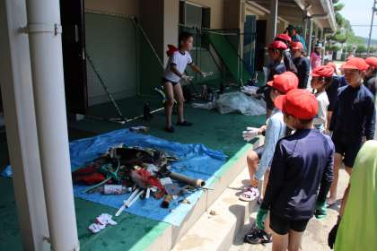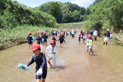 昭和50年7月、当時の児童会が企画した飯野川清掃は、西広瀬小学校が現在も大切に継続している環境教育の始まりです。昨年降雨中止となった反省から、今年度は1週間の期間を設定して、川の状態のよい日に実施することにしました。本日の午前、全校児童出席で無事行うことができました。前半はビニール袋や陶器、缶などを拾い集めました。後半は、昭和50年の小学生たちが夢に描いた川遊びを、全校で楽しみました。「きれいな川で遊びたい」と願って掃除を始めた先輩たちの努力のお陰により、現代の子どもたちは笑顔で遊びました。遊んだ後はゴミを学校に持ち帰り、分別して処分しました。