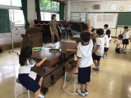 5時間目に音楽室に行くと、1年生が歌を歌っていました。まずは先生の声の大きさや動きを真似しました。次にグループでリーダーを決めて、児童同士で真似し合いました。声の大きさを聞き、動きを観察すると真似ができます。模倣する楽しさを感じながら学んでいました。