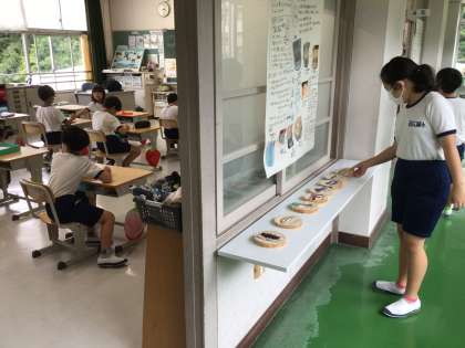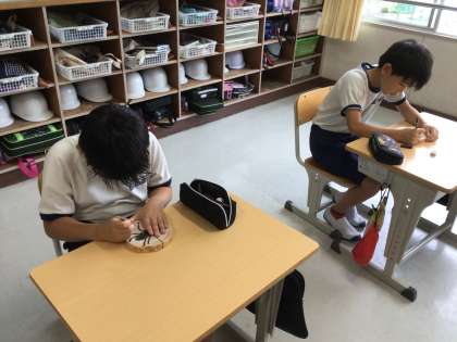 創立150周年記念モニュメントに、西広瀬の自然を題材とした児童の作品を取り付ける計画です。学校ビオトープの入り口3か所に設置します。朝の活動で4年生は丁寧に名前を書いていました。来週はニスを塗る予定です。
