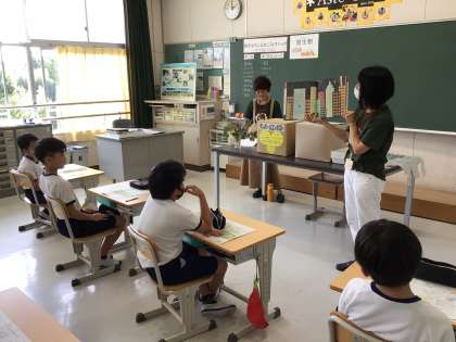 豊田市環境学習施設eco-Tから2名の講師が来校しました。ダンボールコンポストで作られた土を4年生の児童に見せ、生ゴミを減らし、資源を循環させる取り組みを紹介してくださいました。ゴミを分解してくれる微生物の働きを、絵本の朗読によりわかりやすく紹介してくださいました。