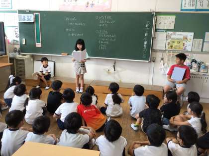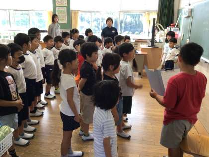 低学年では、一人は後期に頑張ることを進出漢字や数字など、教科ごとに説明をしてくれました。もう一人は、飼っているメダカの飼育ついて紹介してくれました。水槽をきれいに保つ為に、エビやタニシを水槽に入れる工夫をしているそうです。