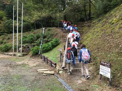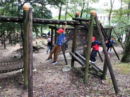 アスレチック広場に来ました。昼食までの時間に、山に点在しているアスレチックをまわります。学校の遊具と違う楽しさを体験しています。