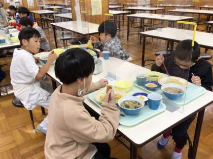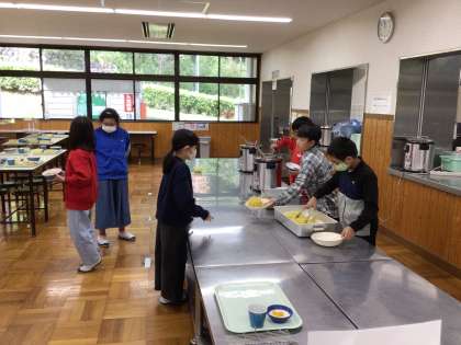 食事係が代表で昼食の準備をしてくれました。メニューは餡かけ焼きそば、ワカメスープ、杏仁豆腐です。おかわりする児童もいます。