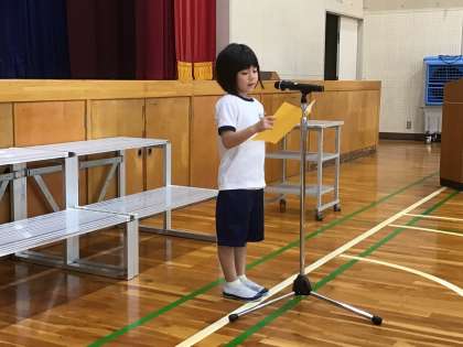 全校スピーチでは、得意な運動の紹介と今度の目標を披露した児童や、飼っている動物をどのようにお世話しているか、嬉しそうに語った児童、委員会活動で努力した事柄やキャンプでのエピソードと150周年記念式典の目標を語ってくれた児童がいました。今回は代表者3名のスピーチでしたが、児童全員が後期に自分らしい目標をもち、後期も前向きに生活できることを願います。