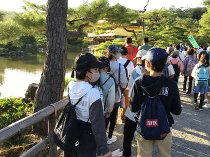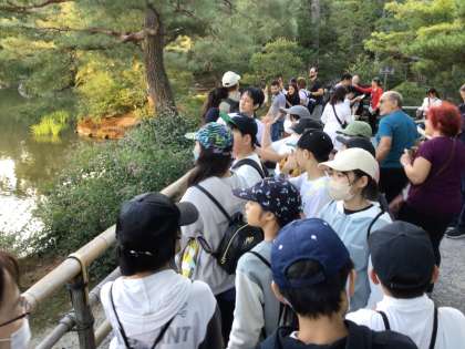 金閣寺に着きました。舎利殿前で集合写真を撮り、ゆっくり散策路を回りました。夕陽を浴びて光る金閣がとても美しく、子どもたちはうっとり眺めていました。金閣寺を出るとホテルに向かいます。