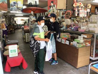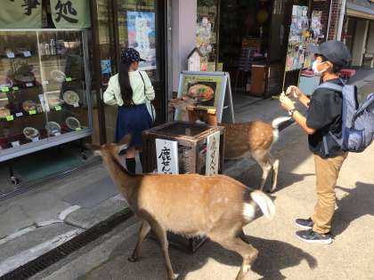 若草山で班に分かれて活動しています。お土産を買ったり、鹿煎餅を買って鹿と遊んだりしています。煎餅を持っている子どもに、鹿がどんどん寄ってきています。