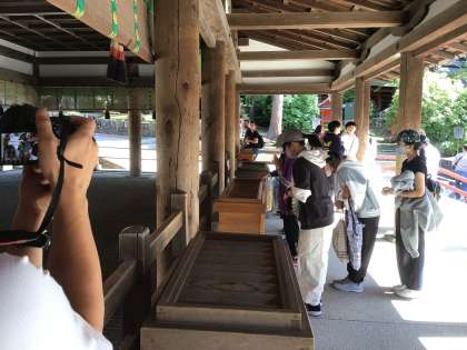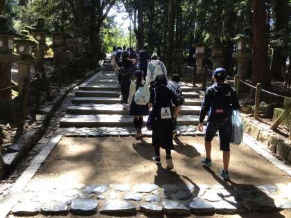 若草山を出発し、春日大社に着きました。お参りをしています。どんな願いを込めたのでしょうか。