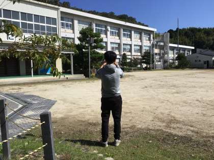 運動場では、校舎写真を撮影する方がいます。ひまわりネットワークの三宅さんです。12月に放送される「ぼくらの学舎」の紹介用の写真撮影をされていました。撮影は11月16日の予定です。