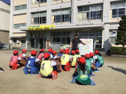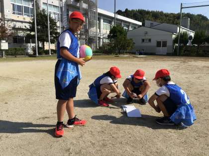 秋晴れの気持ちの良い天気です。高学年がフラッグフットボールに挑戦しています。今日は新たな戦術が示され、今はグループで戦術会議を開いています。考えた通りのプレーができるか、戦術の理解と役割を遂行する力が必要なようです。