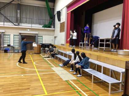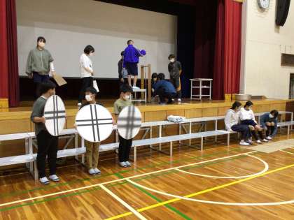 5時間目の体育館では6年生が練習をしていました。式典第3部に当日の矢作川の水質を体育館舞台上で測定し、結果を報告します。先日150センチを記録しました。11月11日の透視度は何センチでしょうか。